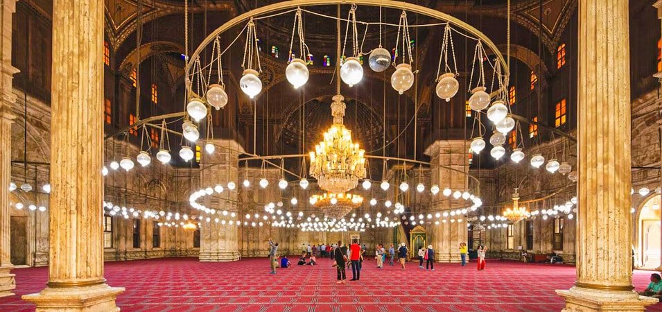 Stepping inside the Mosque of Muhammad Ali is like entering a realm of architectural splendor and spiritual serenity. As you pass through its grand entrance, you’ll find yourself in a spacious and beautifully adorned prayer hall. The central dome, an architectural marvel, seems to reach for the heavens, its intricate patterns and designs captivating visitors’ gazes. The soft, filtered light streams through stained glass windows, illuminating the interior and casting a colorful and calming ambiance. The qibla wall, adorned with verses from the Quran, directs the faithful towards Mecca during prayer. The mosque’s elegant chandeliers hang like celestial ornaments, adding to the luxury and tranquility. As you wander through its halls, you’ll also discover smaller chambers, including the mausoleum of Muhammad Ali Pasha himself. The serene atmosphere inside the mosque invites reflection and contemplation, making it a profoundly spiritual and culturally enriching experience for all who visit.